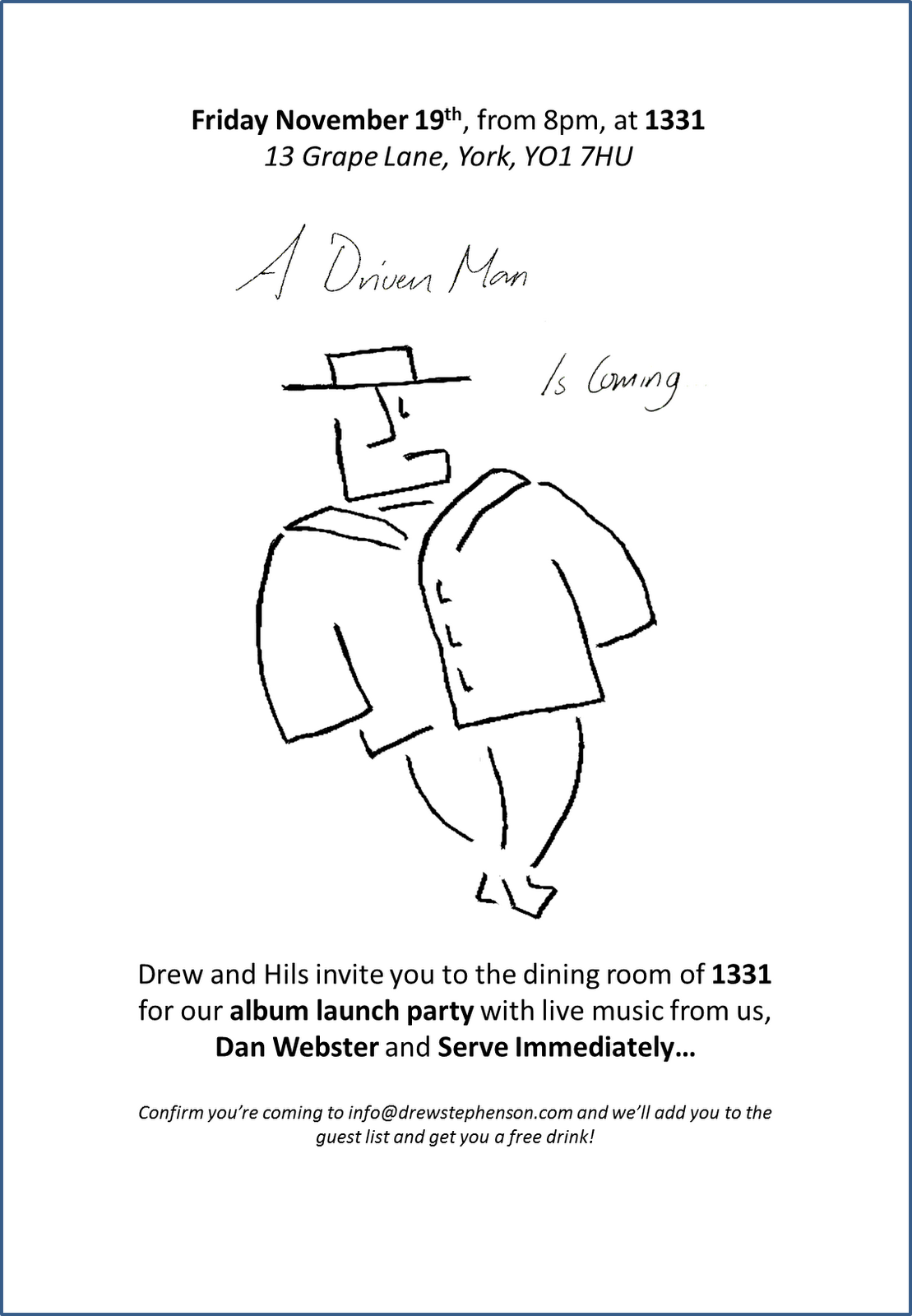 To say thank you for all the support we've had, we'd like to buy you a drink, so if you're going to come down, drop me a line, we'll add you to the guest list, and your first drink is on us!